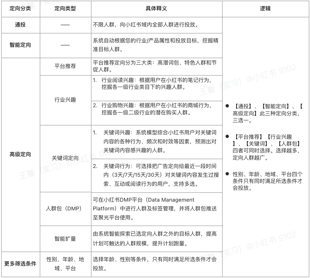 小红书信息流定向,主要分为【通投】【智能定向】【自定义】【更多筛选条件】四大类,以下是每种定向能力的具体释义和选择时需注意的逻辑。